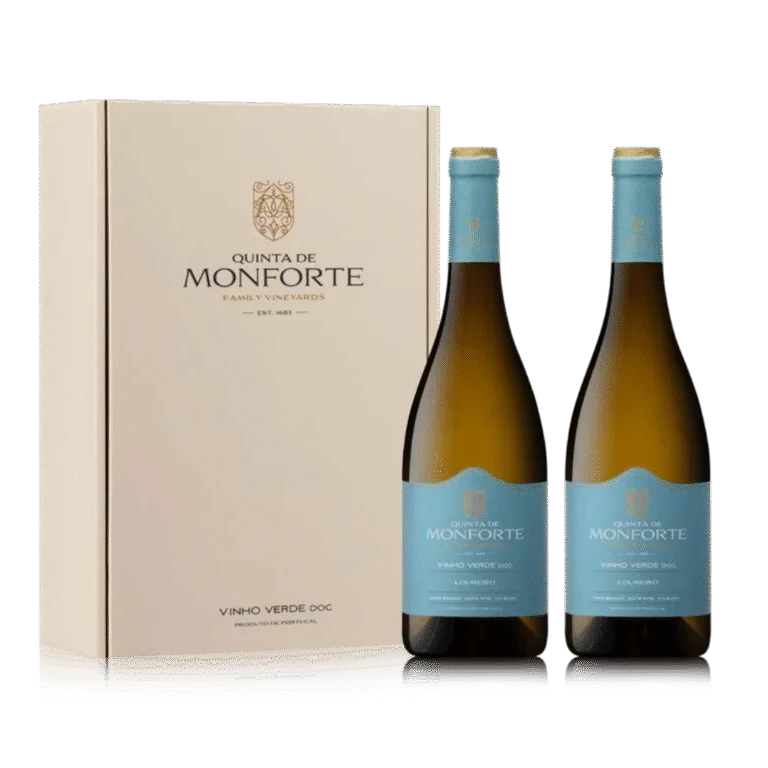 Conjunto vinho branco Quinta de Monforte com duas garrafas e caixa branca